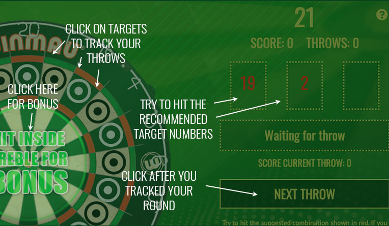 Get 21 with 2 darts gives you 5 points and a bonus throw. During bonus throw, you need to hit inside the treble ring and gives you 3 extra points. Get the score 21 with 3 darts gives you 3 points. If you get more than 21 you're busted and no score for this round. Trebles and doubles count as singles in this game. 10 throws!